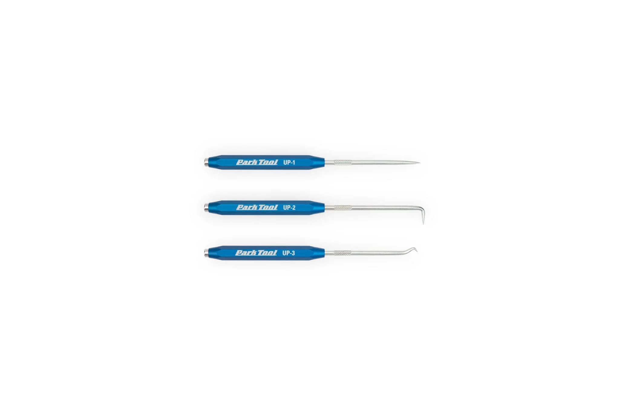 The Park Tool UP-SET is a set of three unique multi-purpose picks ideal for a wide variety of fine detail work performed on a bicycle, including removing O-rings and bearing seals, opening up pinched housing, and other scenarios where no other tool will do. The UP-SET includes a straight, hooked and 90 degree pick, so you always have the right pick for the job. The base of each anodized aluminum handle features a strong magnet, useful for retrieving and removing small items such as ball bearings, washers or fasteners, or for storing the picks on a repair stand or metal tool board. Each pick is replaceable, cold formed, heat treated and polished high carbon steel.